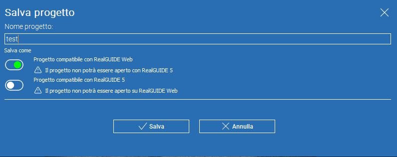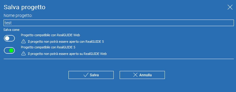 - Formato RealGUIDE 5: compatibile con le vecchie versioni di RealGUIDE e quindi consigliato a coloro che condividono progetti con colleghi che non hanno la nuova versione. Il salvataggio in questo formato NON consente però la visualizzazione dei progetti tramite RealGUIDE Web e Weblink;
