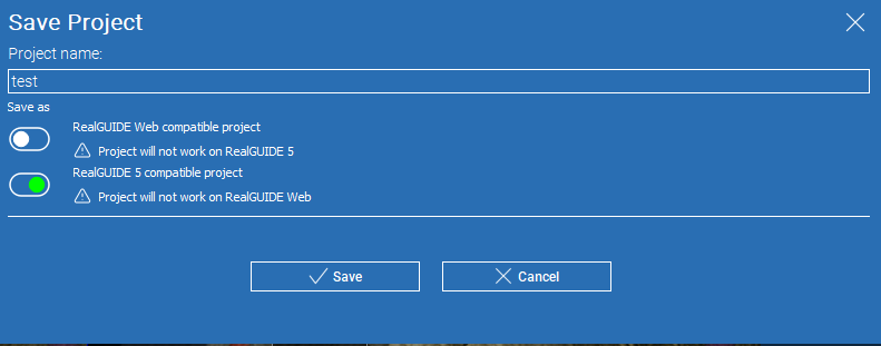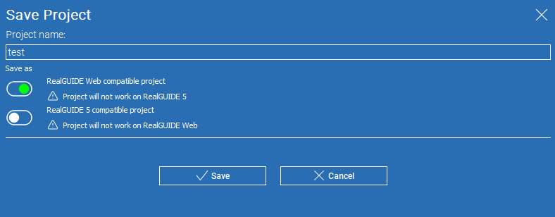 RealGUIDE 5 format: compatible with RealGUIDE older versions and therefore recommended for those who share projects with colleagues whithout the new software version. Saving in this format does NOT allow project visualization through RealGUIDE Web and Weblink.