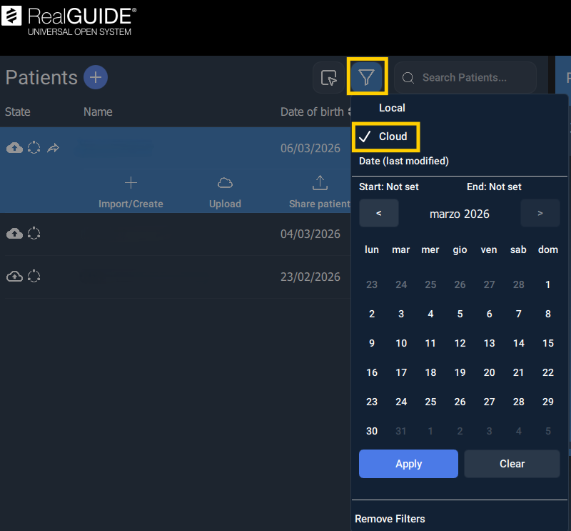 - select the Filter icon and select the Cloud option. This will show you only those patients for whom you have uploaded at least one project to the CLOUD and who are therefore taking up space;