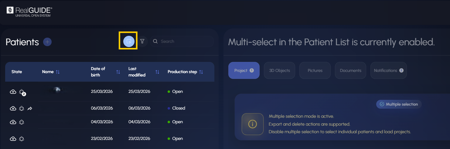 - if you wish to remove the patient (and all his projects), click on the Delete icon next to the patient list. This will delete both the projects in CLOUD and LOCAL database;