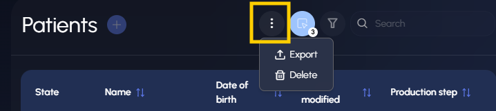 - By clicking on the three dots on the side, you will be given the option to export the selected patients or delete them directly;
