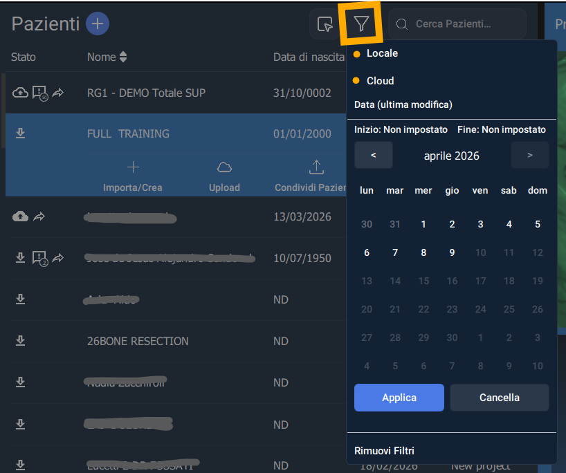 Inoltre, la nuova lista pazienti offre strumenti di filtro avanzati che consentono di organizzare rapidamente i propri dati in base alle esigenze operative. È possibile filtrare la lista per posizione dei dati, visualizzando solo i pazienti salvati in locale, solo quelli presenti nel cloud oppure quelli sincronizzati in entrambe le modalità, oppure per periodo temporale, mostrando esclusivamente i pazienti gestiti in uno specifico intervallo di tempo.