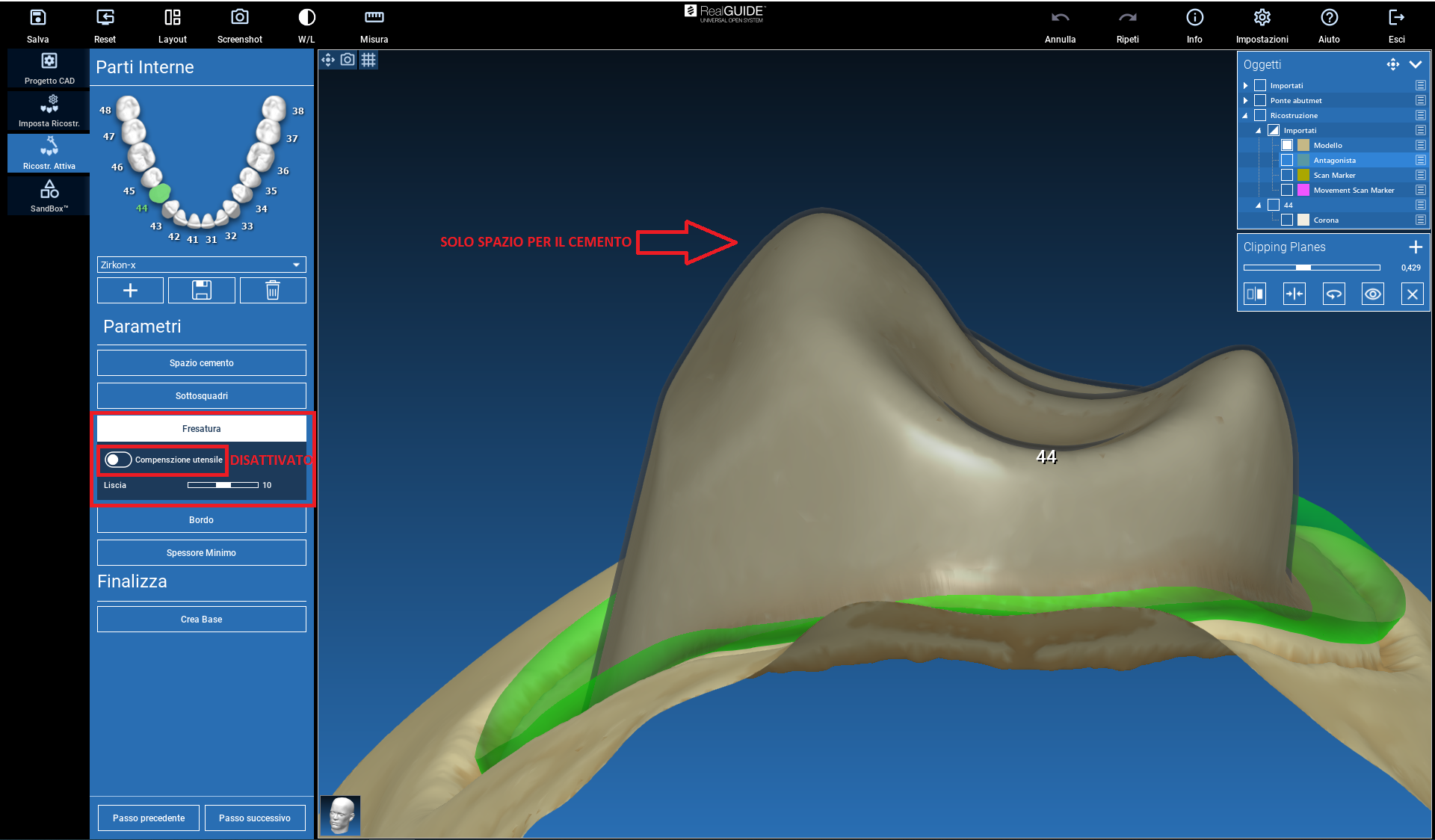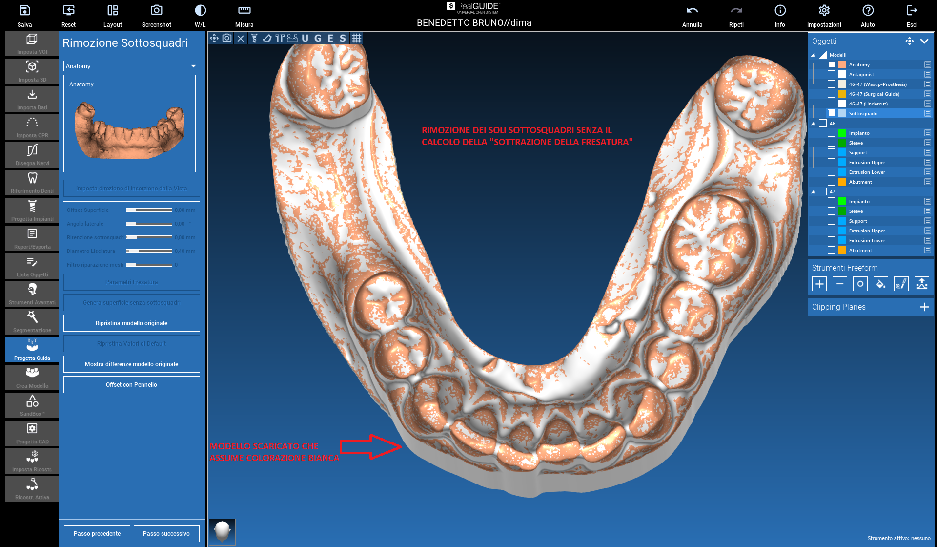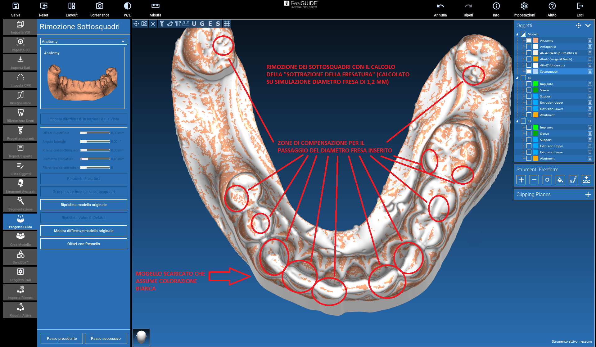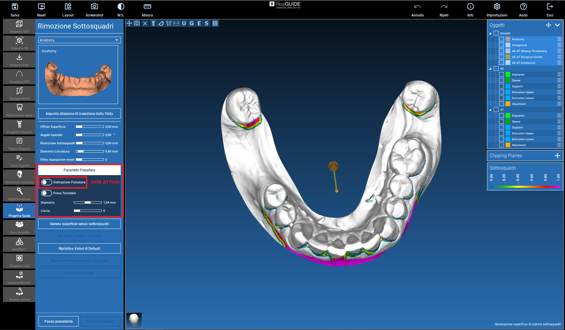 La non attivazione di tali parametri porta ad avere il solo scarico dei sottosquadri sul modello destinato alla costruzione della dima/guida chirurgica: