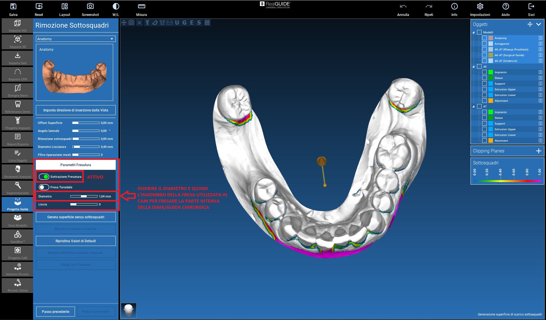 I parametri di fresaggio sono presenti nella fase di progettazione del modello su cui andrà costruita la guida chirurgica, esso dovrà essere scaricato, cioè privo di sottosquadri.