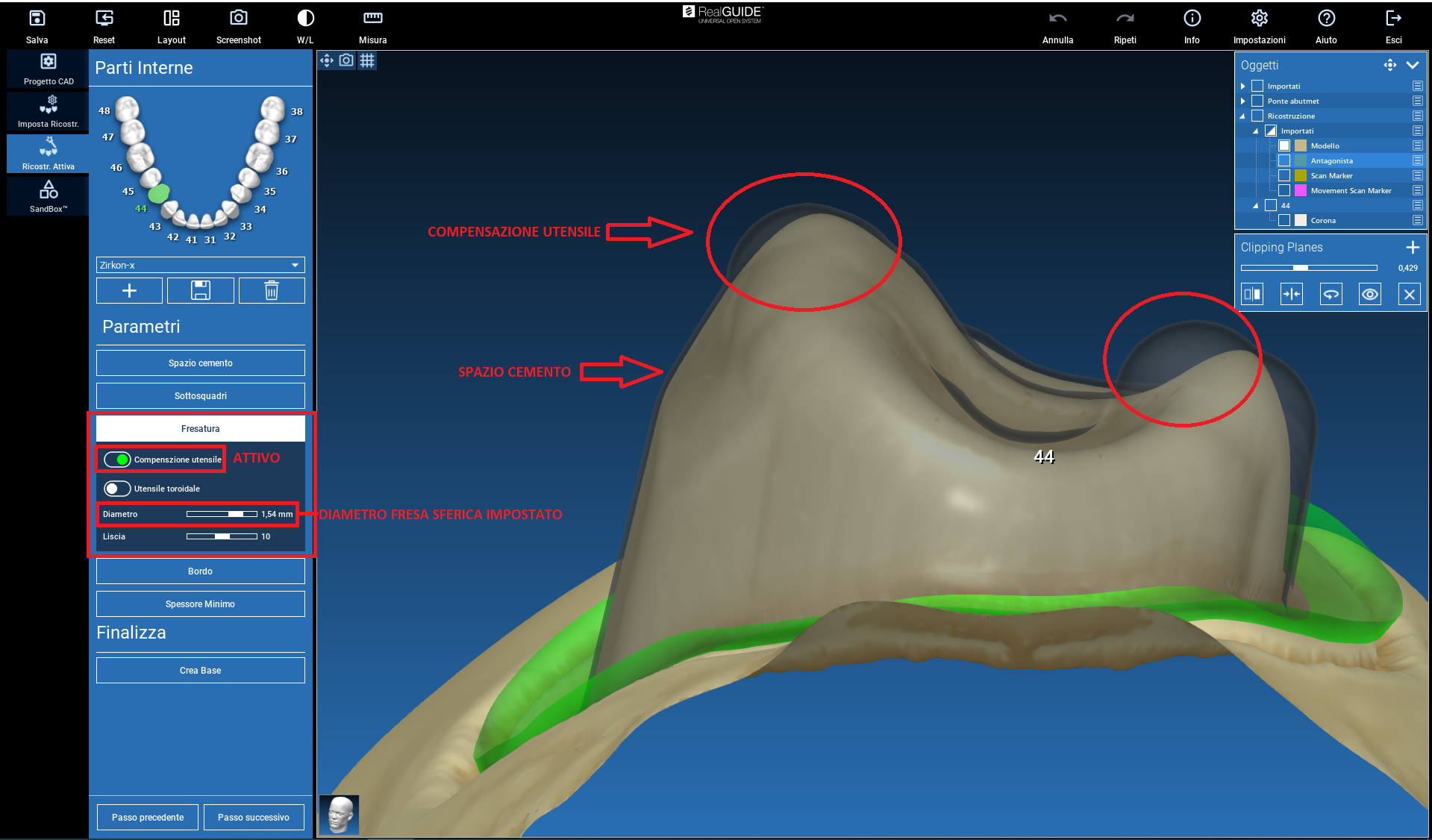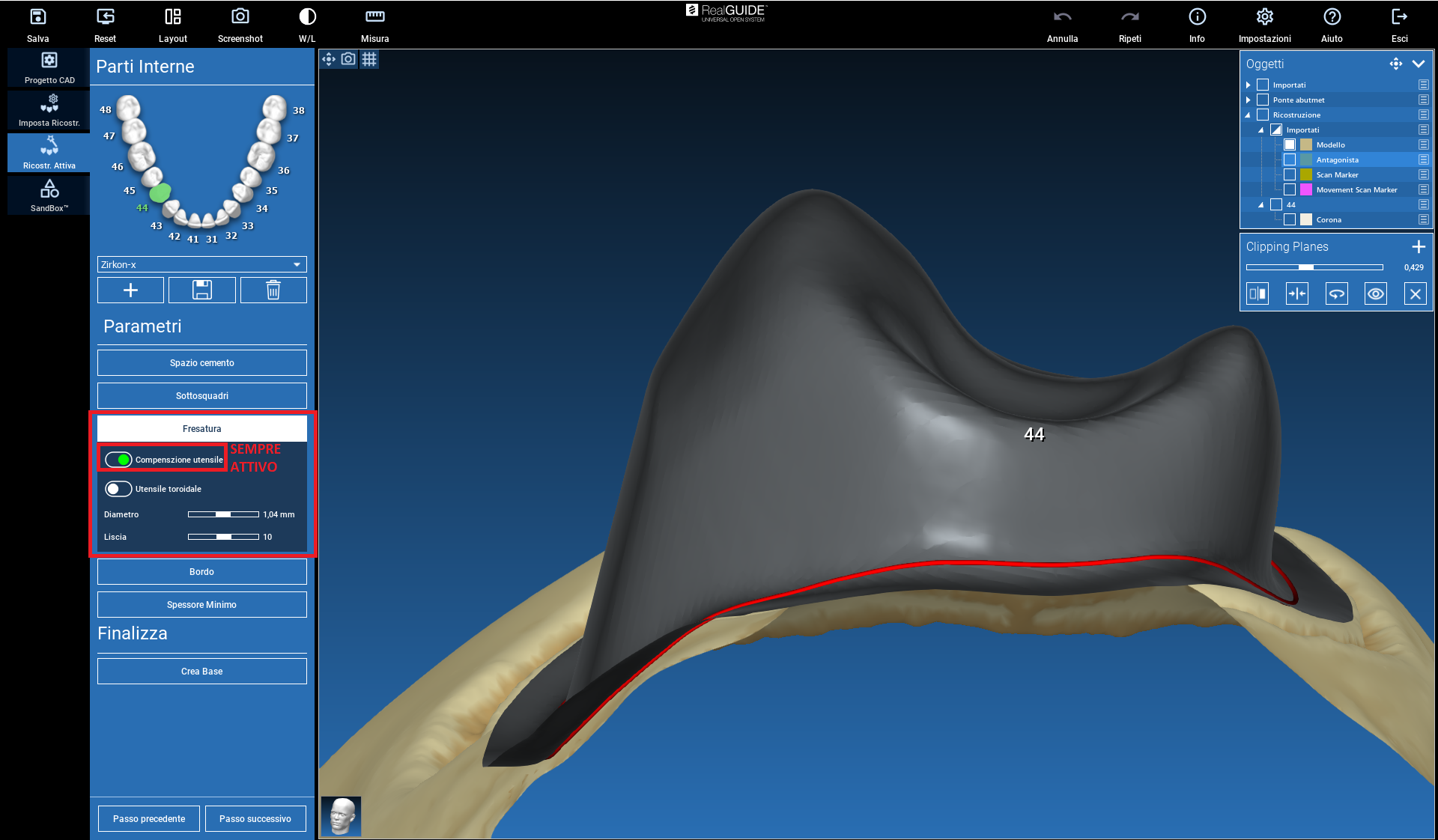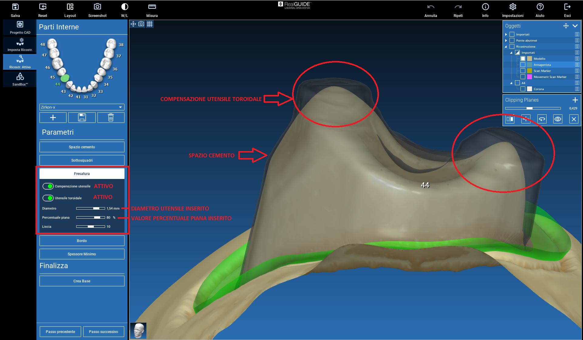 fresare correttamente qualunque tipo di oggetto realizzato con RealGUIDE (guide chirurgiche, ricostruzioni protesiche, oggetti creati con il Sandbox, etc.), è necessario impostare dei parametri indispensabili affinché la parte a contatto con la preparazione o il modello