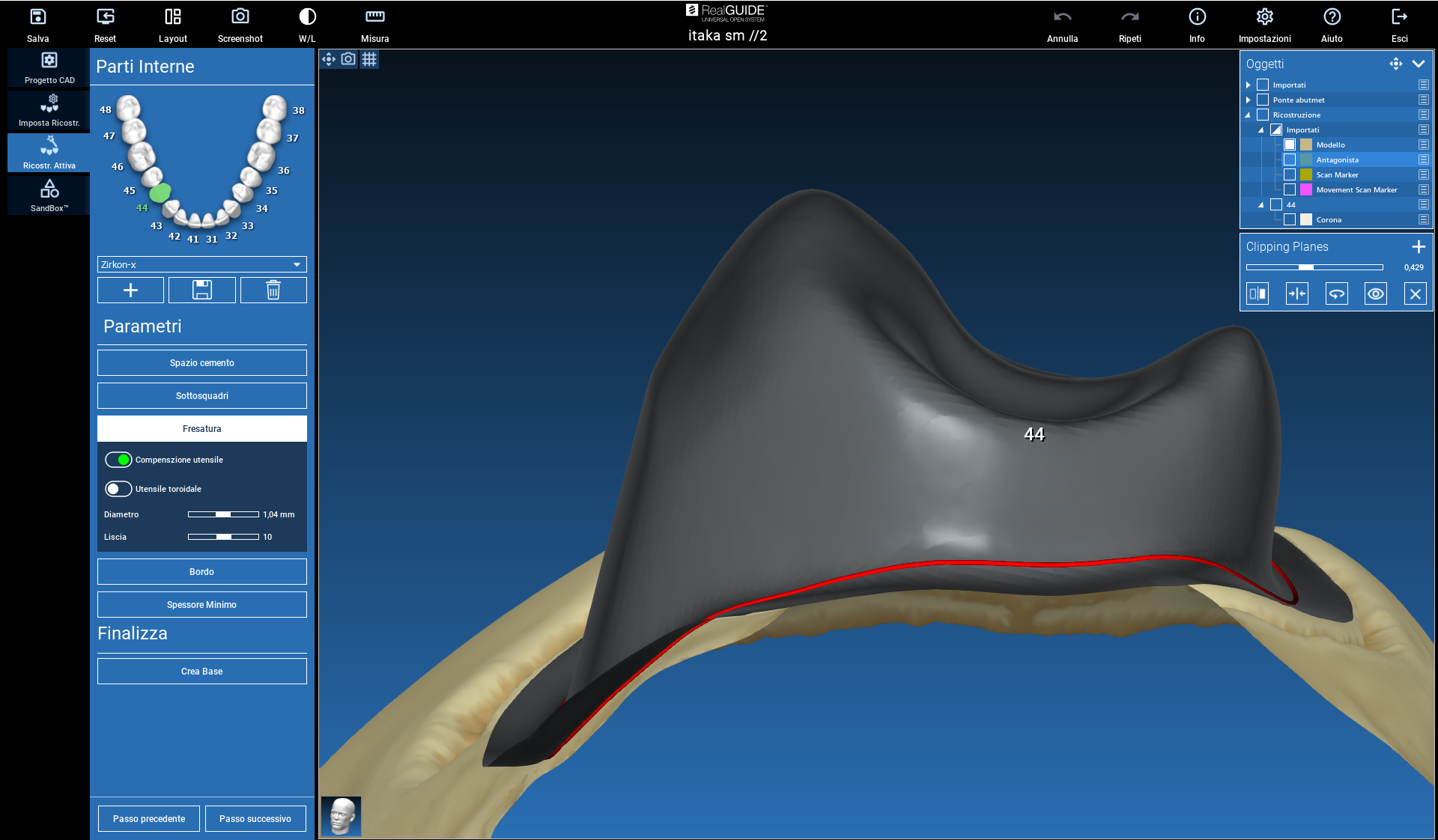 si può quindi procedere al disegno della dima/guida chirurgica, alla sua esportazione ed al fresaggio.