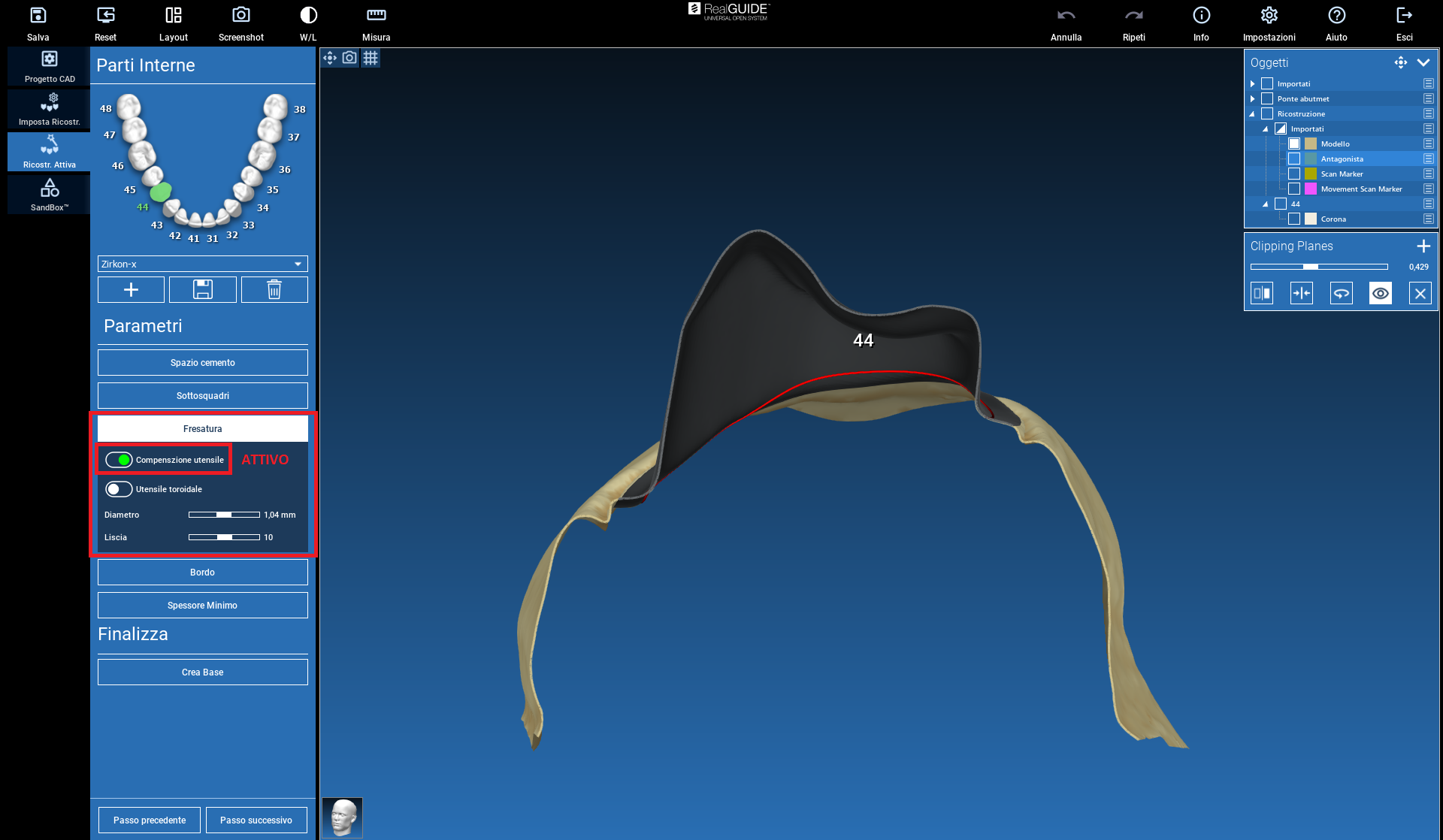 L'attivazione dei parametri avviene attraverso l'attivazione del icona "Parametri di fresatura", una volta aperto il menù a disposizione, si attiva la funzione di "Sottrazione fresatura" e si inserisce il diametro fresa utilizzata per il fresaggio della parte interna della dima/guida chirurgica, consigliamo di inserire una leggera tolleranza, rispetto il diametro nominale della fresa , per cui se viene dichiarata una fresa da 1 mm inserire un valore di 1,04/1,06,ecc.. mm. Questo per evitare di creare cavità troppo precise, dato che questo potrebbe creare problemi in quanto nella operazione di fresatura si deve sempre stabilire il percorso del centro utensile della