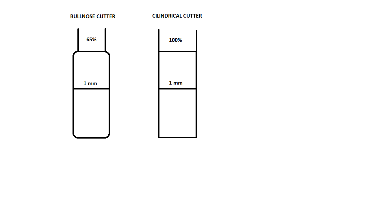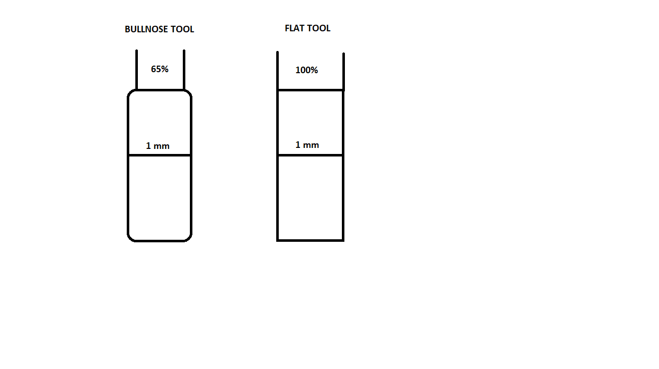 The 'Bullnose/Flat milling cutter' option allows you to enter the diameter of the tool used in the milling process and to enter the 'flat percentage' of the cutter. So for the sake of argument, if we enter a milling cutter diameter of 1 mm and a flat percentage value of 100%, we will have a perfectly Flat tool. If we enter a milling cutter diameter of 1 mm and a flat percentage value of 80%, we will have a Bullnose tool: