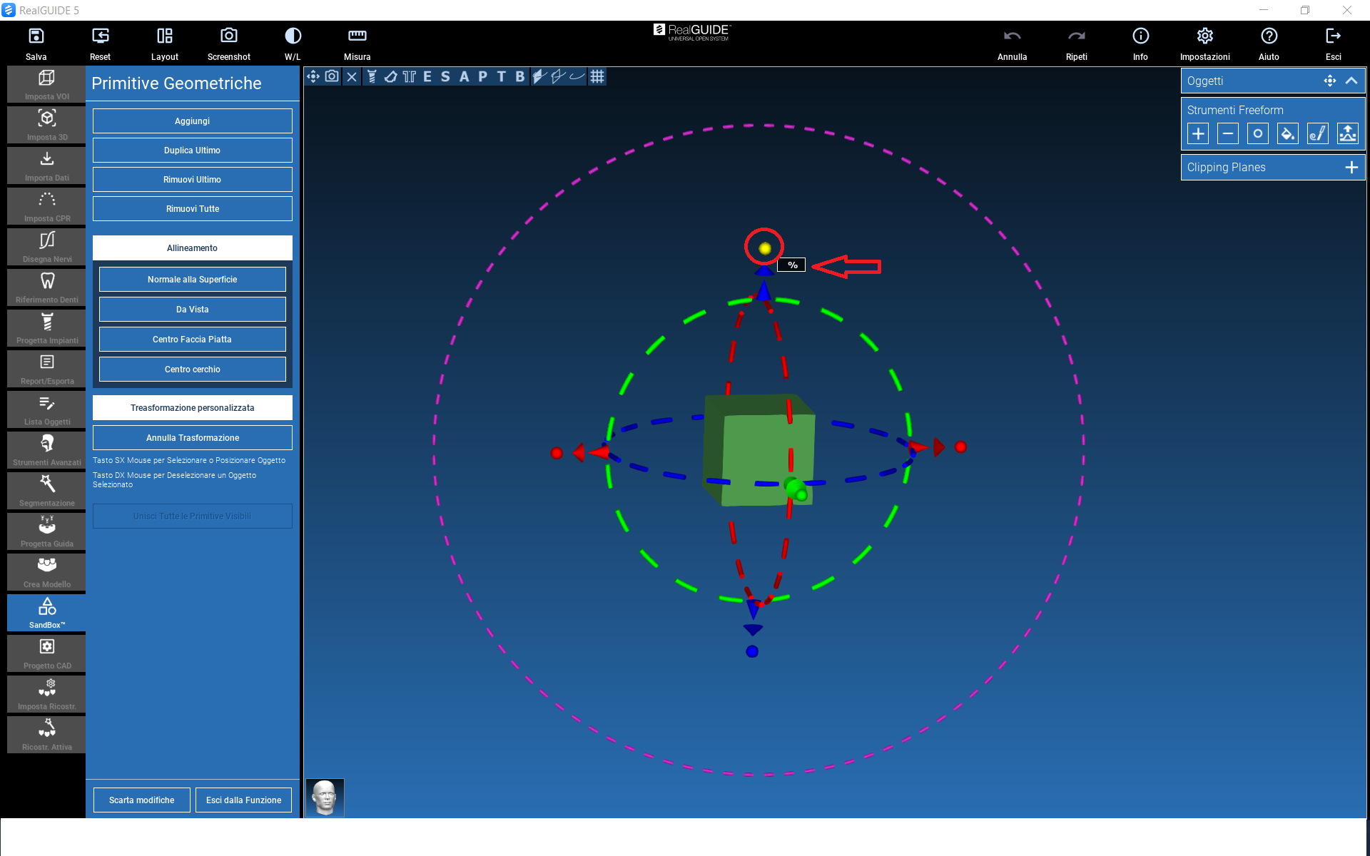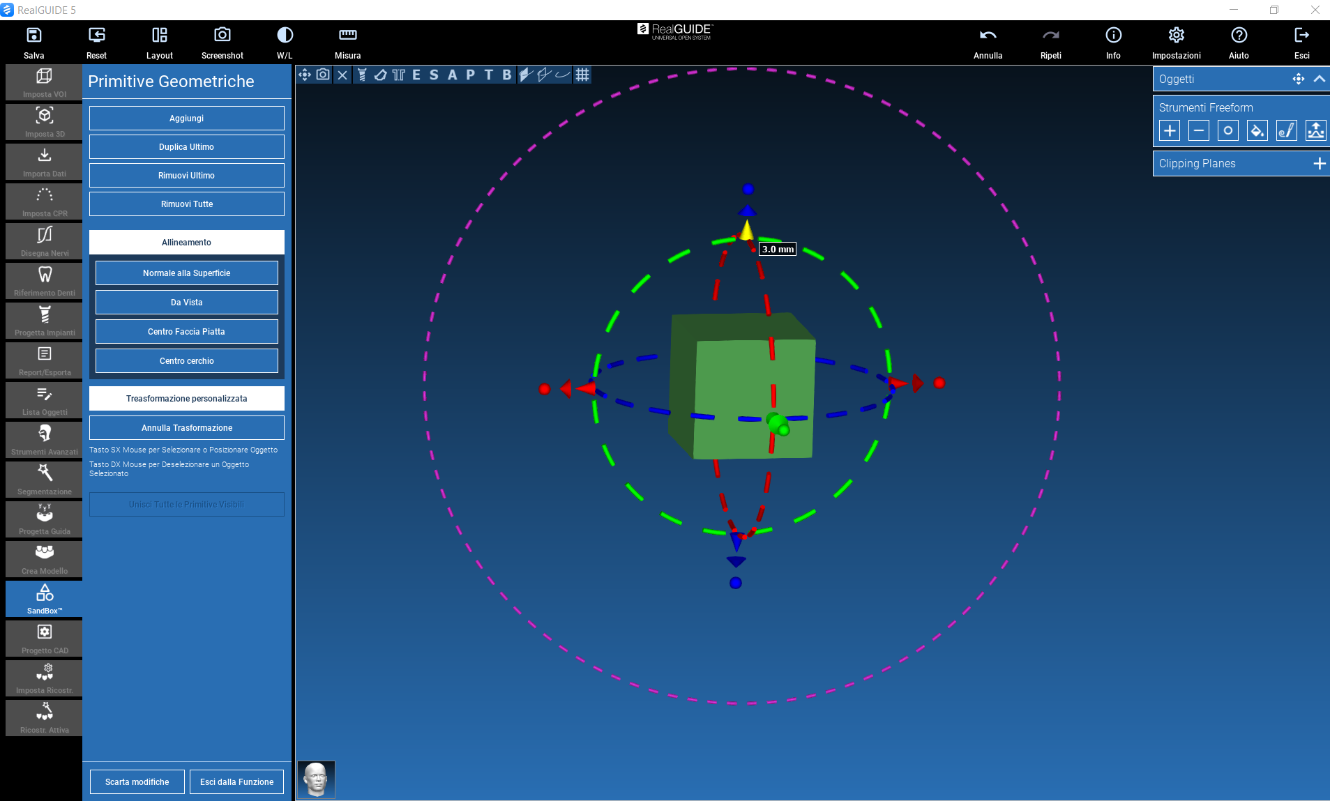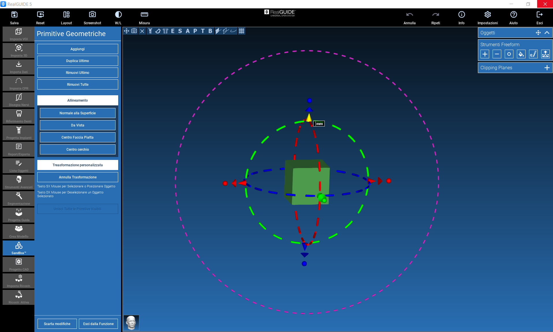 The action can be performed by dragging the arrow in the direction of interest (left mouse button), or by clicking on the arrow itself, which will be highlighted in yellow: a window will appear where you can enter a numerical value (in mm) of the desired displacement along the selected direction.