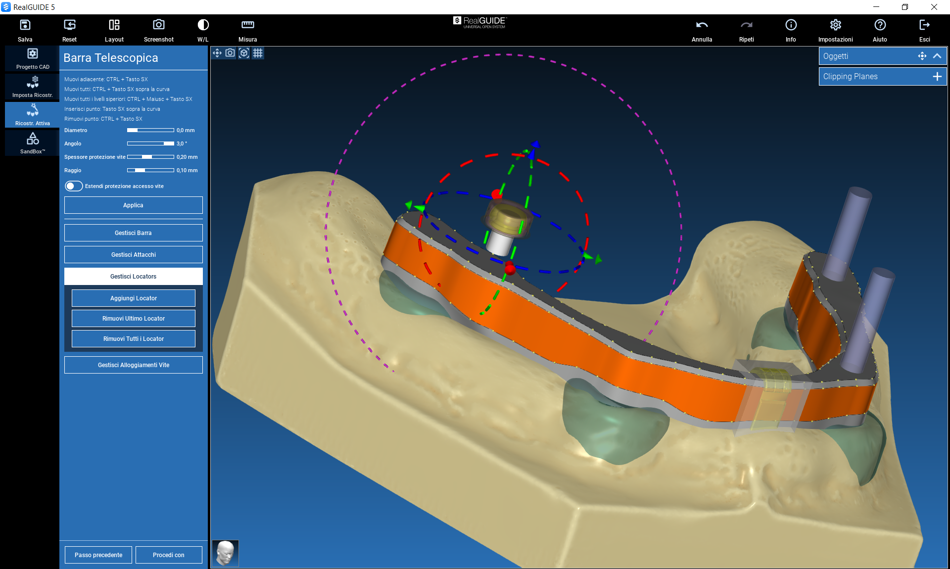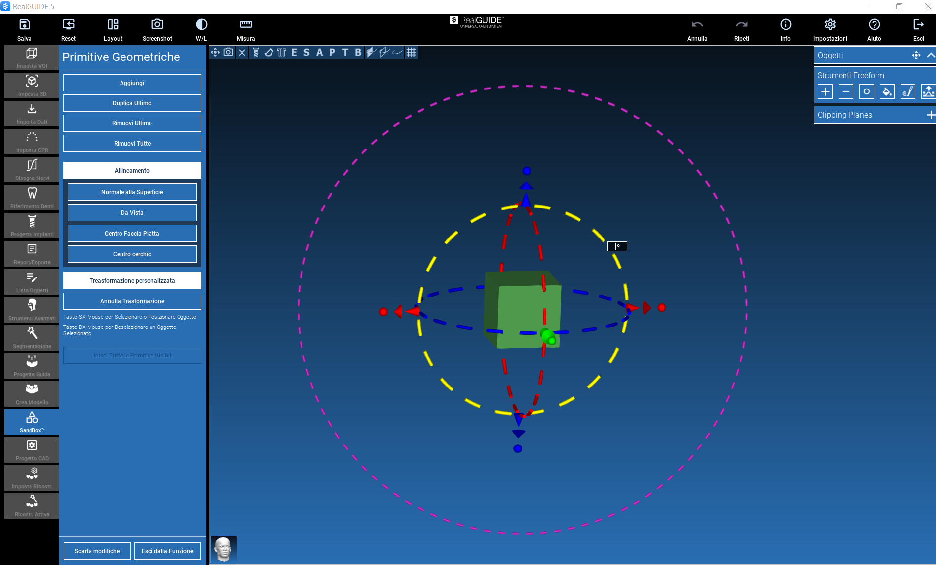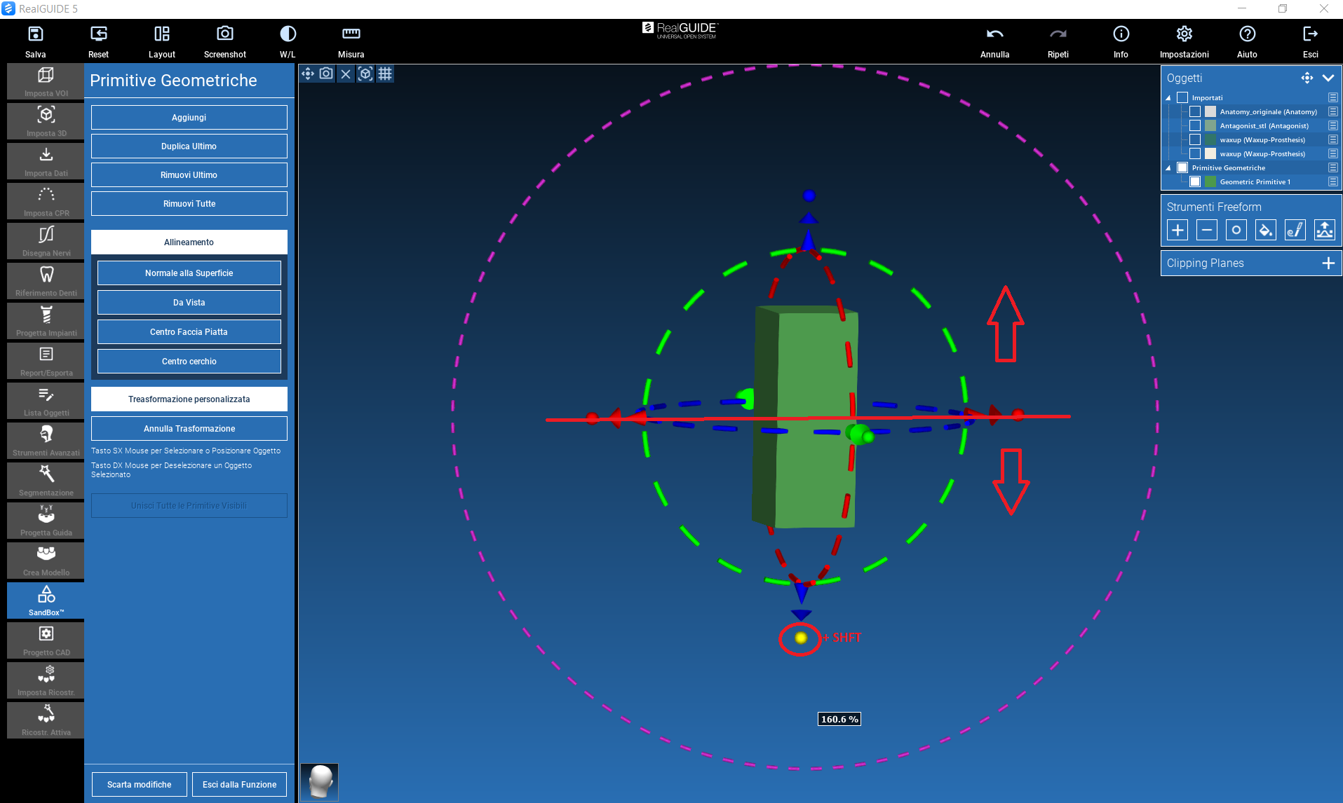 The action can be performed by dragging the arrow in the direction of interest (left mouse button), or by clicking on the arrow itself, which will be highlighted in yellow: a window will appear where you can enter a numerical value (in mm) of the desired displacement along the selected direction.