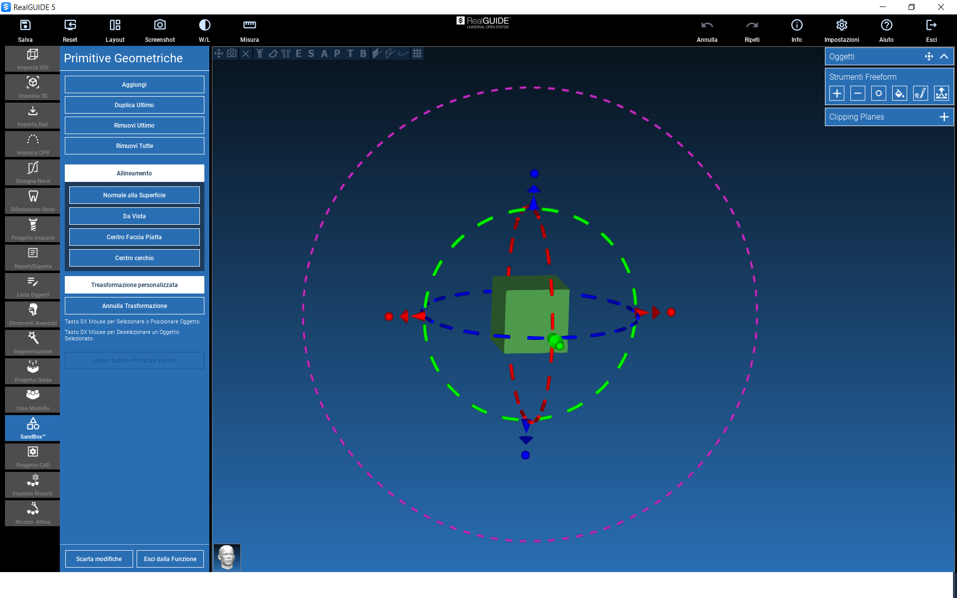 To scale an object, act on the CONTROL POINTS, represented by the dots shown in the figure below (BLUE, RED, GREEN dots): the object will be scaled volumetrically with respect to the 3D object's center.